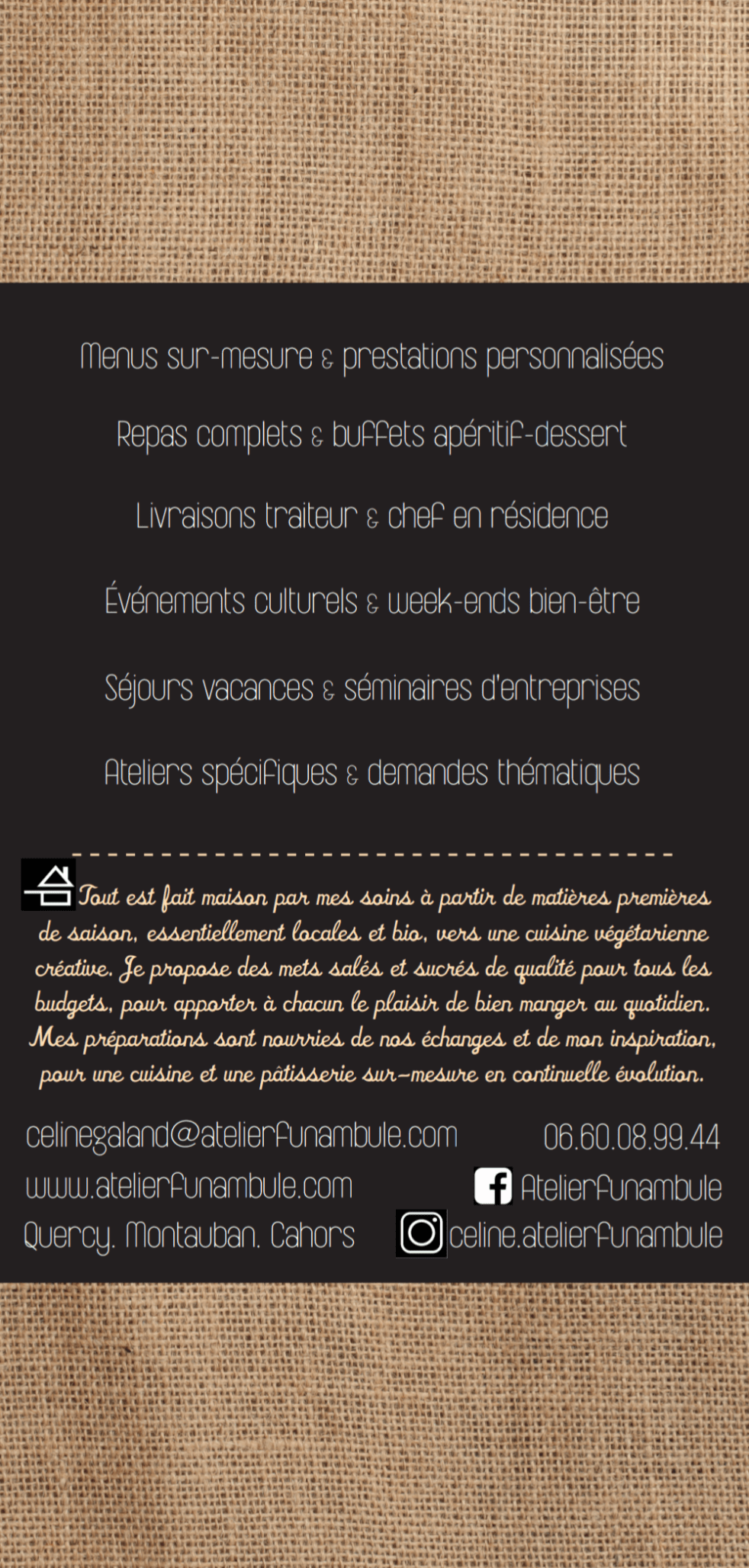 Mes services sont ouverts à tous les possibles pour des comités de taille modérée (10 à 40 personnes pour des repas à table, 10 à 80 personnes pour des repas en buffet) : menus complets et à la carte (apéritif dînatoire, buffet de desserts), repas de stages et séjours (yoga, vacances), restauration d’événements artistiques et culturels (banquets d’inaugurations, vernissages d’expositions), catering artistique (résidences, spectacles), ateliers spécifiques (personnalités hypersensibles, profils autistiques), marchés gourmands (marchés de plein vent, marchés de créateurs).
